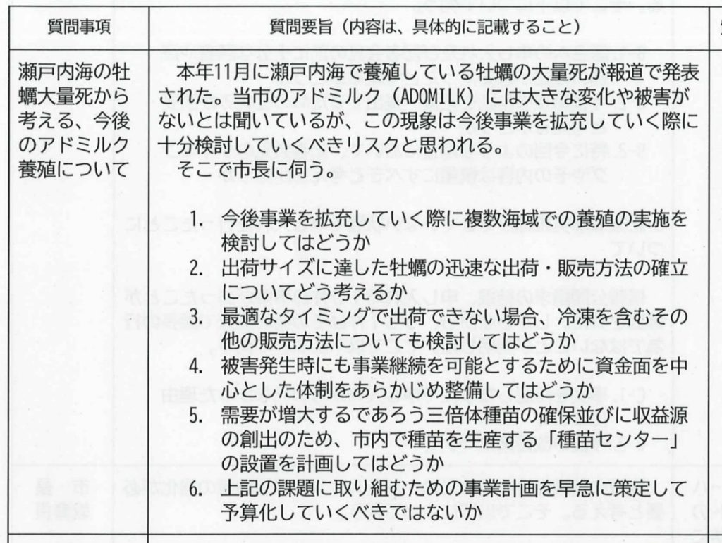 1問目 瀬戸内海の牡蠣大量死から考える、今後のアドミルク養殖について