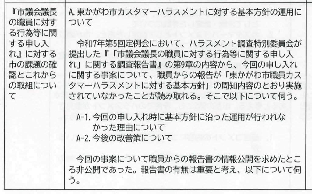 2問目 『市議会議長の職員に対する行為等に関する申し入れ』に対する市の課題の確認とこれからの取組について