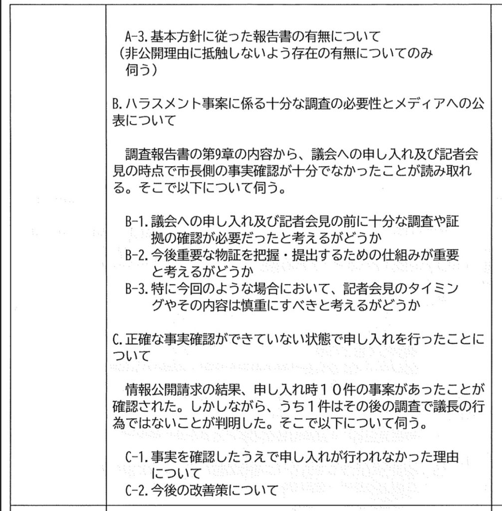 過去の問題点を探るのではなく、手法や取組に問題がないかを把握したうえで今後の市のハラスメント対策がいいものになるようになってほしいということからです。