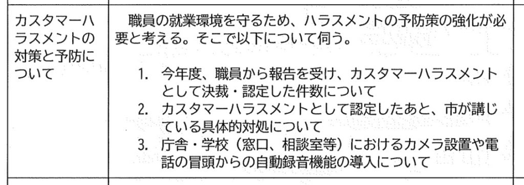 職員向けのデジタル目安箱にも、設置当初からハラスメントの被害について想像を超える数の声が、想像を超える深刻さの事案の報告が届いています。ハラスメントの対象としては、もちろん、庁舎内の上司から、同僚から、市民から(いわゆるカスハラ)もありますが、議員からのハラスメントの報告も散見されます。(一部引用)
