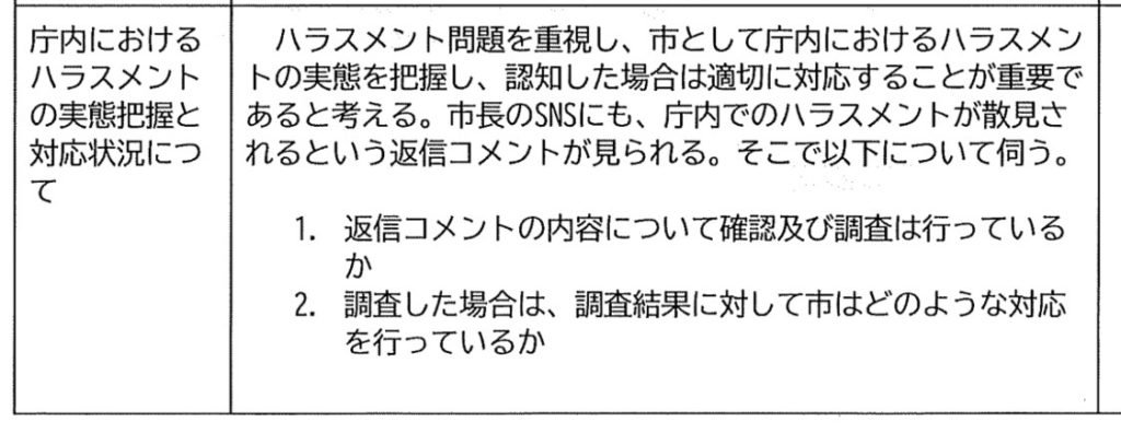 議員からのハラスメントの報告も散見されますとありますので、ここは議長が確認していくと思いますが、市役所職員に関することであれば市長の勤めです。