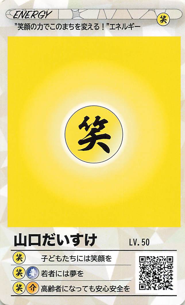![]() ![]() | ①エネルギーカード 笑顔の力でこのまちを変える! 全ての行動の原動力が「笑顔」です 一番下の3つは、笑顔を作るための行動指針(バリュー(Value))です 第2版は3つのエネルギーの総合カードにしました |