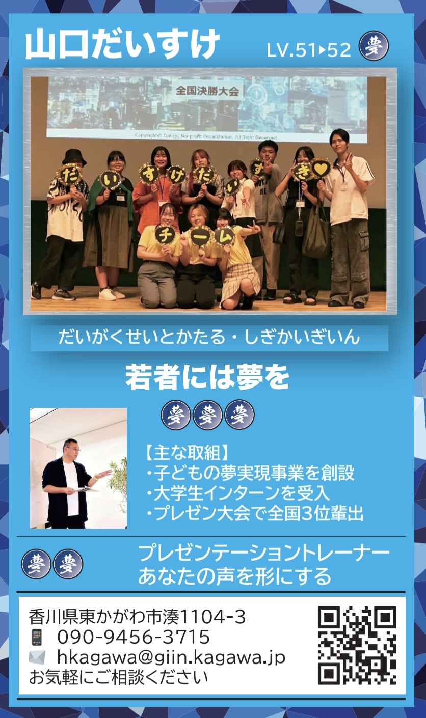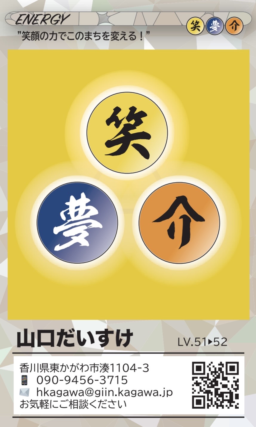 ![]() | ⑨だいすけだいすきメンバーシップカード 国民民主党のサポーターに僕経由でなってもらった方へお送りしたメンバーカード。パスワードと専用サイトは黒塗りしていますが、登録者さんへお送りしたものと同じカードです。 なにか作ってみようと思い趣味を兼ねて作りました。 他県連にはないサポーター・党員登録のノルマが香川にはあります。義務ではなく楽しみに変えるためにこういったグッズを作ってみて遊ぶように取り組むようにしています。 次年度も募集中です(笑) |