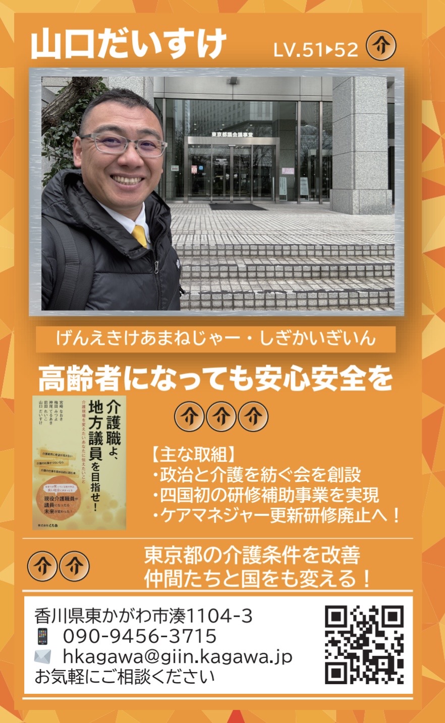 | ④高齢者になっても安心・安全を[介] 介護約30年の経験で歳を重ねても安心できる選択肢のあるまちを目指します。その思いは市だけではなく国をも変える灯りとなります 第2版は東京都議会へ行ったときの写真へ変更。この日東京の歴史が十数年ぶりに動きました。 | ![]() ![]() |