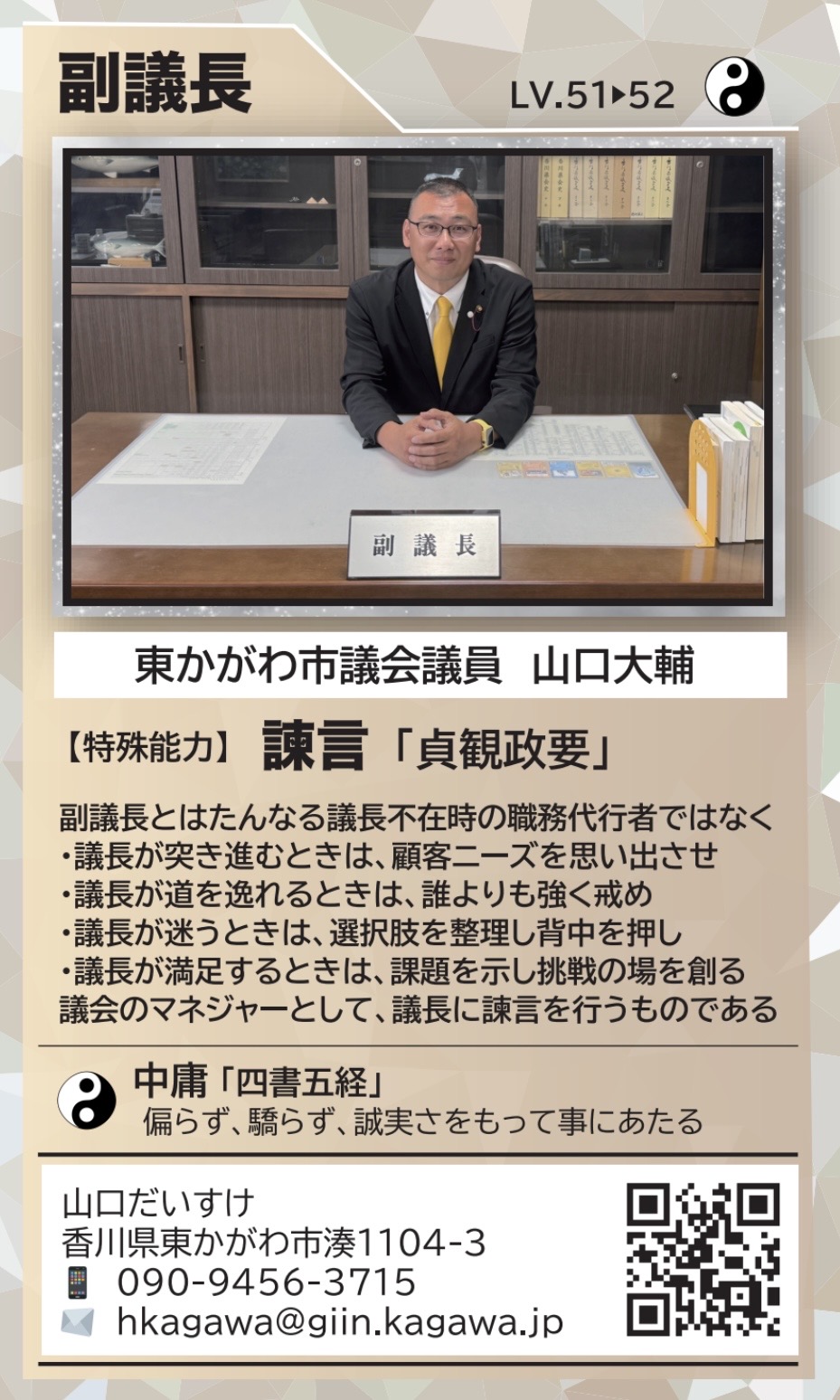 | ⑥副議長 パワーアップカードと称して議員カード渡したあとに付けてます。 議長の控えではなく、諫言(かんげん)を行う存在として議会改革に努めていきます。 第2版はレベルのみ変更 | ![]() ![]() |