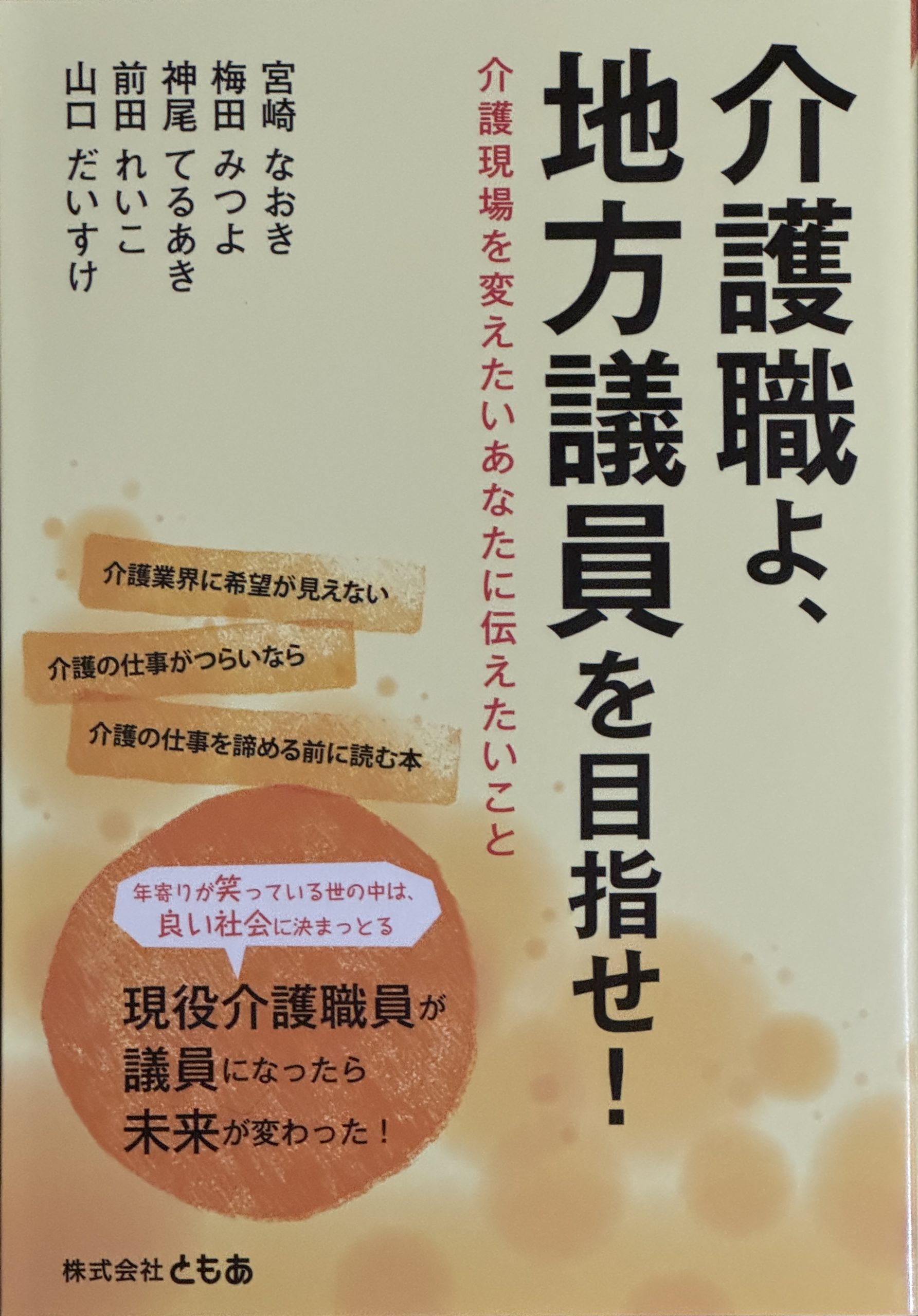 | ⑥介護職よ、地方議員を目指せ!(2021年出版) 介護関係の議員で話し合ったときに、次に挑戦する人を作るためにはメディアの力が必要だという話が出ました。そうやって出来たのがこの著書です。この本を知って問い合わせてきて議員になった人も何人もでてきました。 日本で唯一の介護福祉と政治を近づけたグッズだと思っています。 ぜひみんなに読んでほしくて、今回献本いたします。 ぜひお近くの介護福祉関係者の方にもそういった方を支えようとしている政治家や団体があることを伝える手段にしてもらえたら幸いです。 | ![]() |