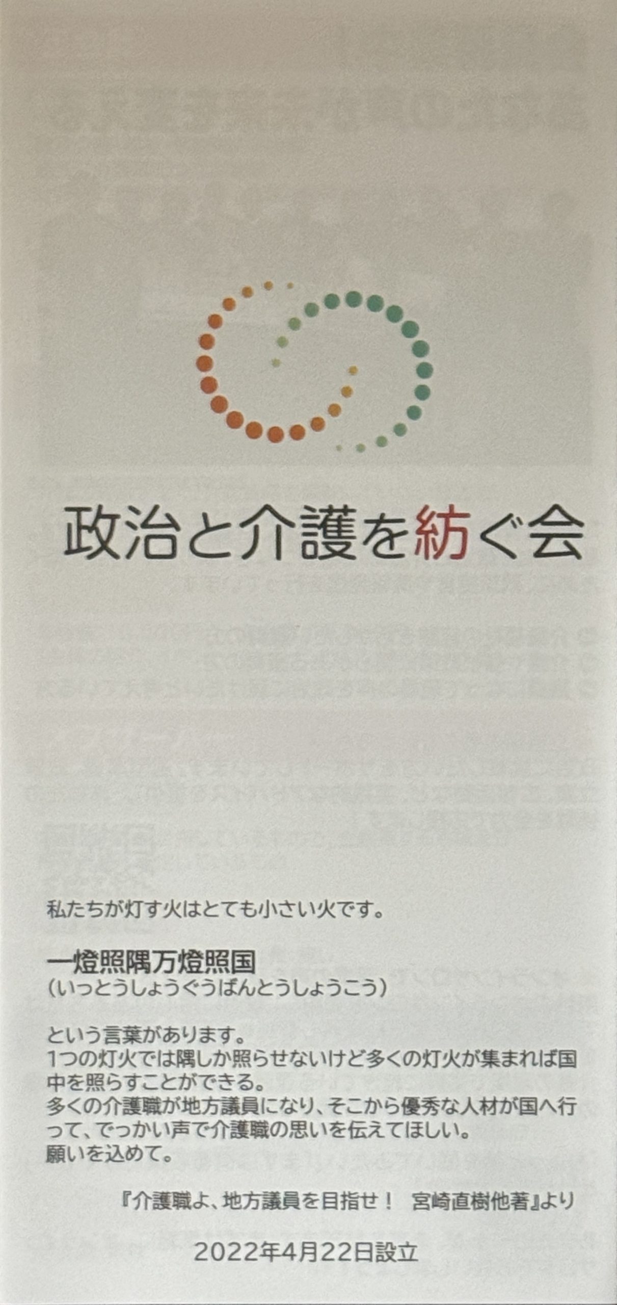 | ⑧政治と介護を紡ぐ会リーフレット 本を出したあと、受け入れて一緒に成長する組織を作ろうと話し合い摂理した介護福祉系の議員で作る超党派の団体です。 現在は僕が事務局長として、ほぼすべての裏側をと運営を担っています。 ここに集まってきた現場のお悩み事を代表に訴え、結果として公約になり、実現に進んでいくことも出来ました(ケアマネジャーの更新研修を廃止) また2025年には、同様に東京都の現場の方からの相談を受け取り組んだ結果東京都の要項改正を実現することが出来ました。 介護福祉の議員が全国に必要と強く感じています。 (会の紹介をするためにこういったリーフレットも作ってみました) | ![]() |