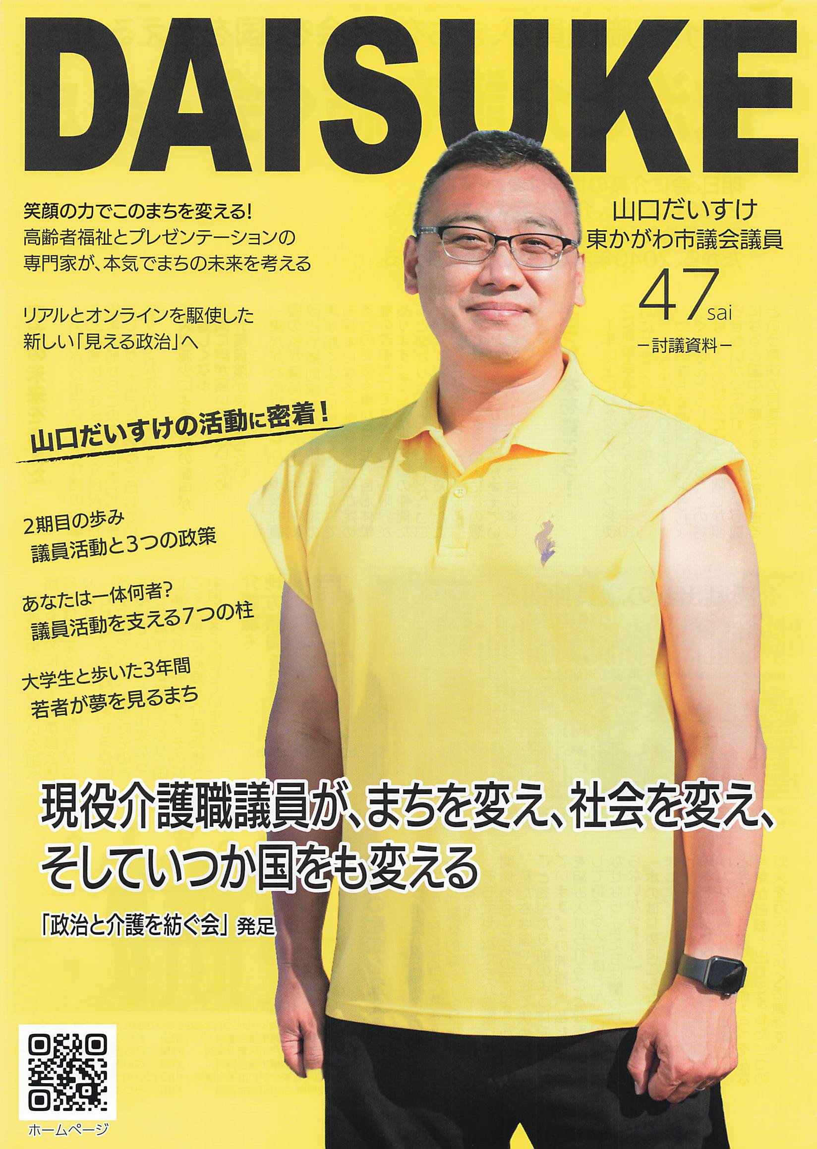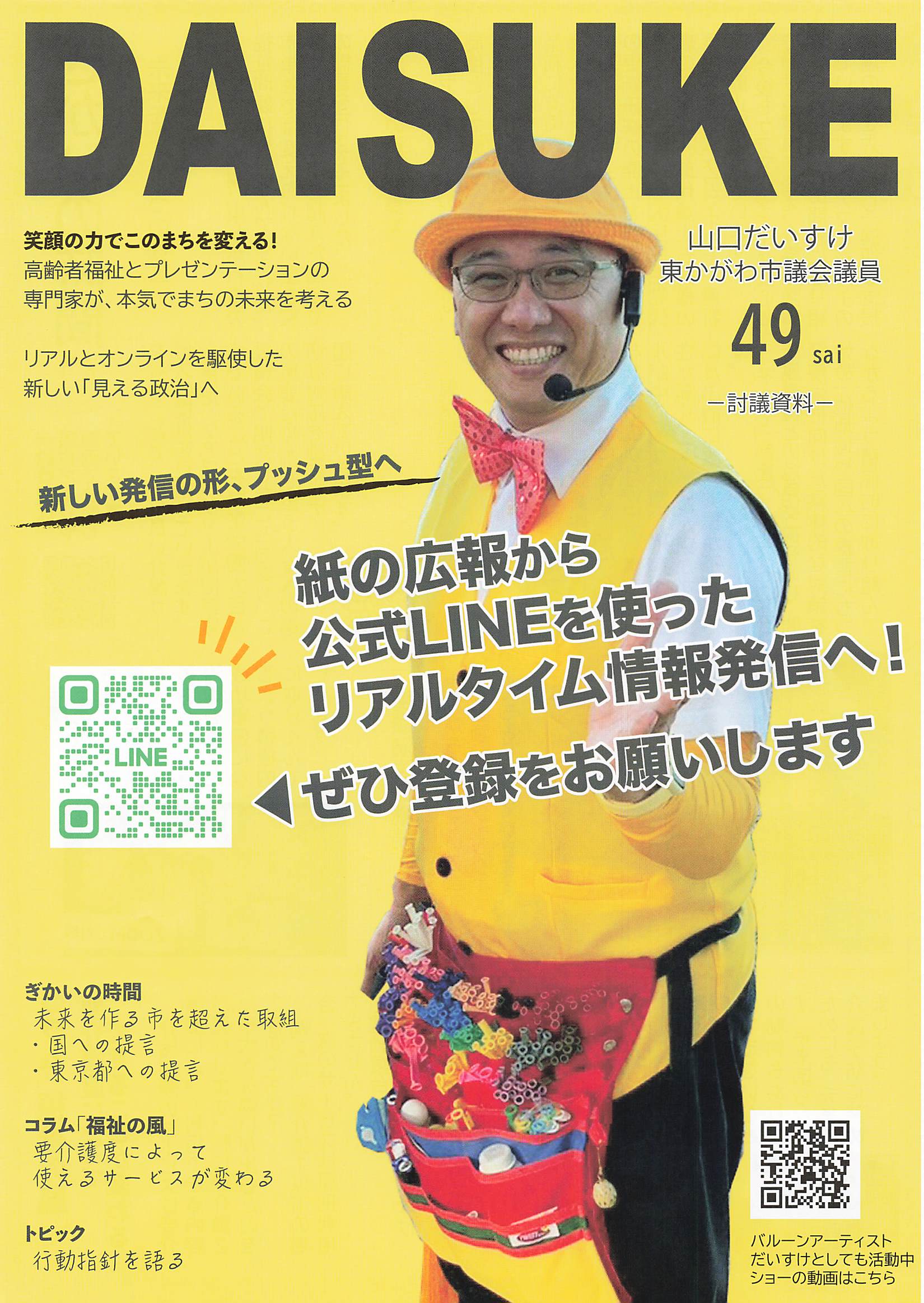 | ②48歳号 選挙に当選してすぐに発行した広報紙です。選挙中の動画をQRから見えるようにしています。裏面が一番人気で、地元のちょっとした情報を書くようにしています。政治より地元のこういった話を見たい人が多いので、むしろ政治より三面記事を大切にしています。 広報紙は読んでもらうものではなく、記憶に残すものと割り切ってます。 | ![]() |